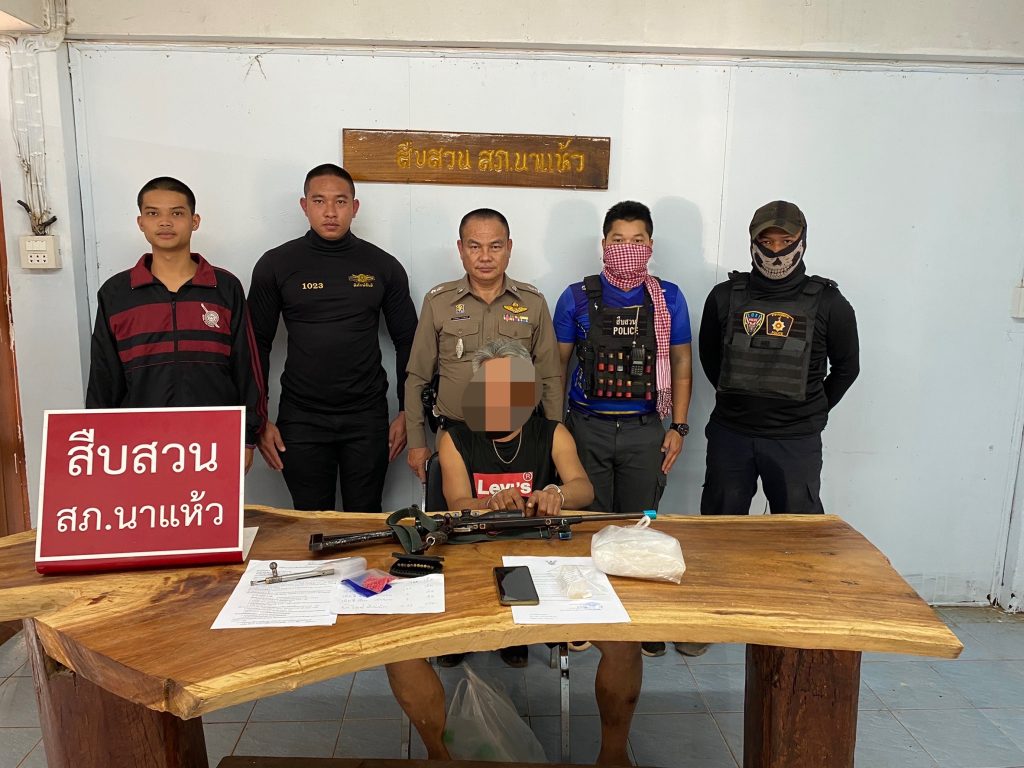ชุดสืบสวน และสายตรวจ สภ.นาแห้ว ร่วมกันปล่อยแถวระดมกวาดล้าง และได้ทำค้นตาม