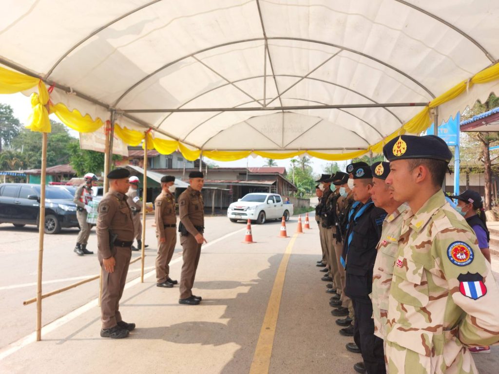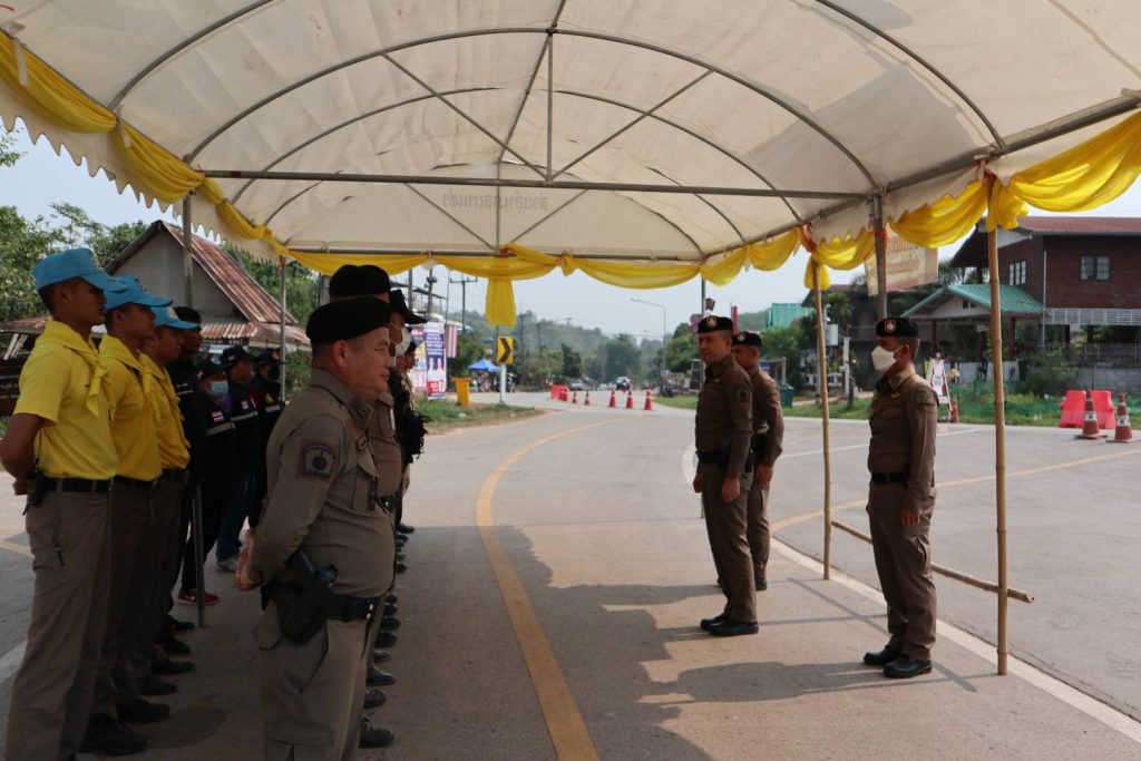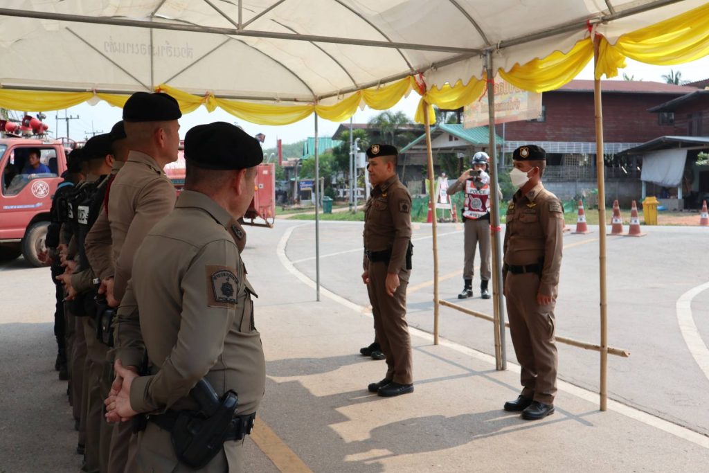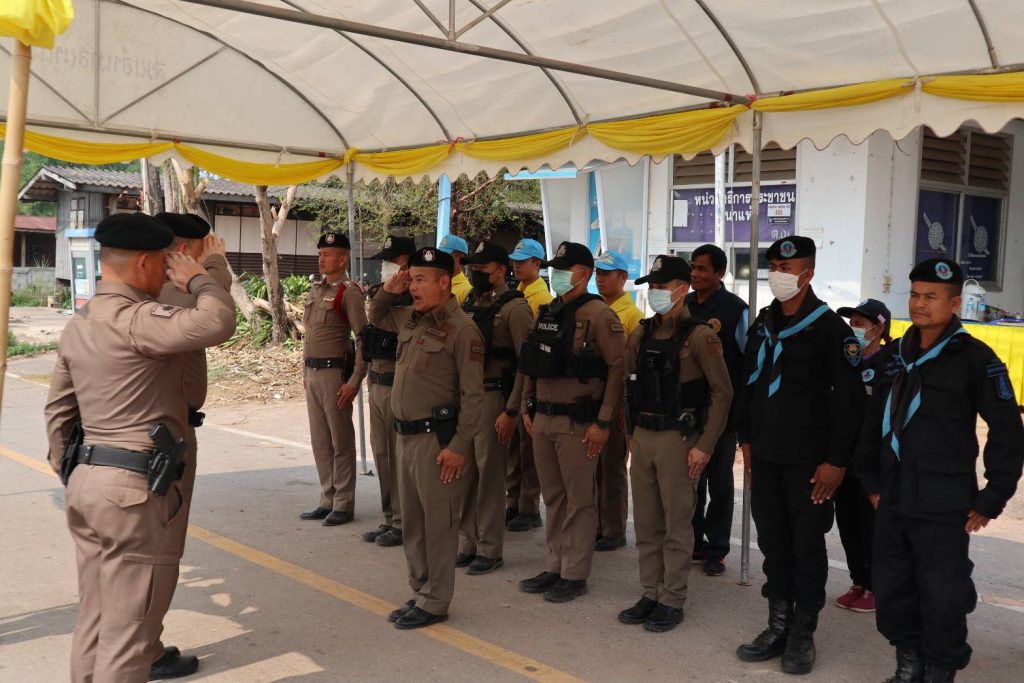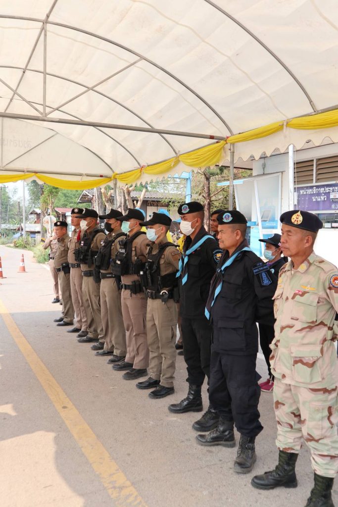 นำ ข้าราชการตำรวจ ปกครองอำเภอนาแห้ว ทหารพราน ตั้งแถวรอรับการตรวจความพร้อม จุดบริการประชาชน ช่วงเทศกาลสงกรานต์ จาก พ.ต.อ.ณัฐกฤต คำวิเศษชัย รองผู้บังคับการตำรวจภูธรจังหวัดเลย (เลย6)