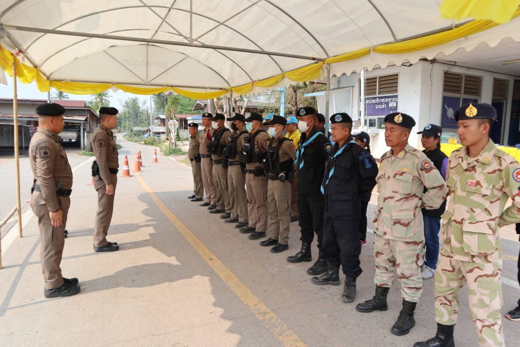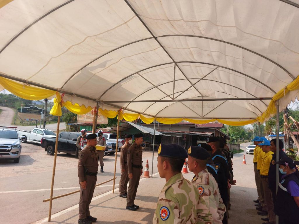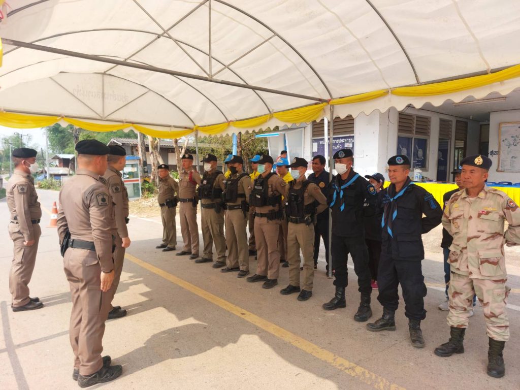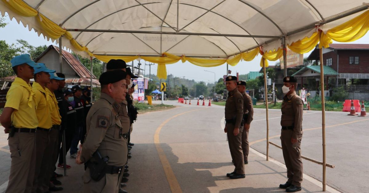 นำ ข้าราชการตำรวจ ปกครองอำเภอนาแห้ว ทหารพราน ตั้งแถวรอรับการตรวจความพร้อม จุดบริการประชาชน ช่วงเทศกาลสงกรานต์ จาก พ.ต.อ.ณัฐกฤต คำวิเศษชัย รองผู้บังคับการตำรวจภูธรจังหวัดเลย (เลย6)