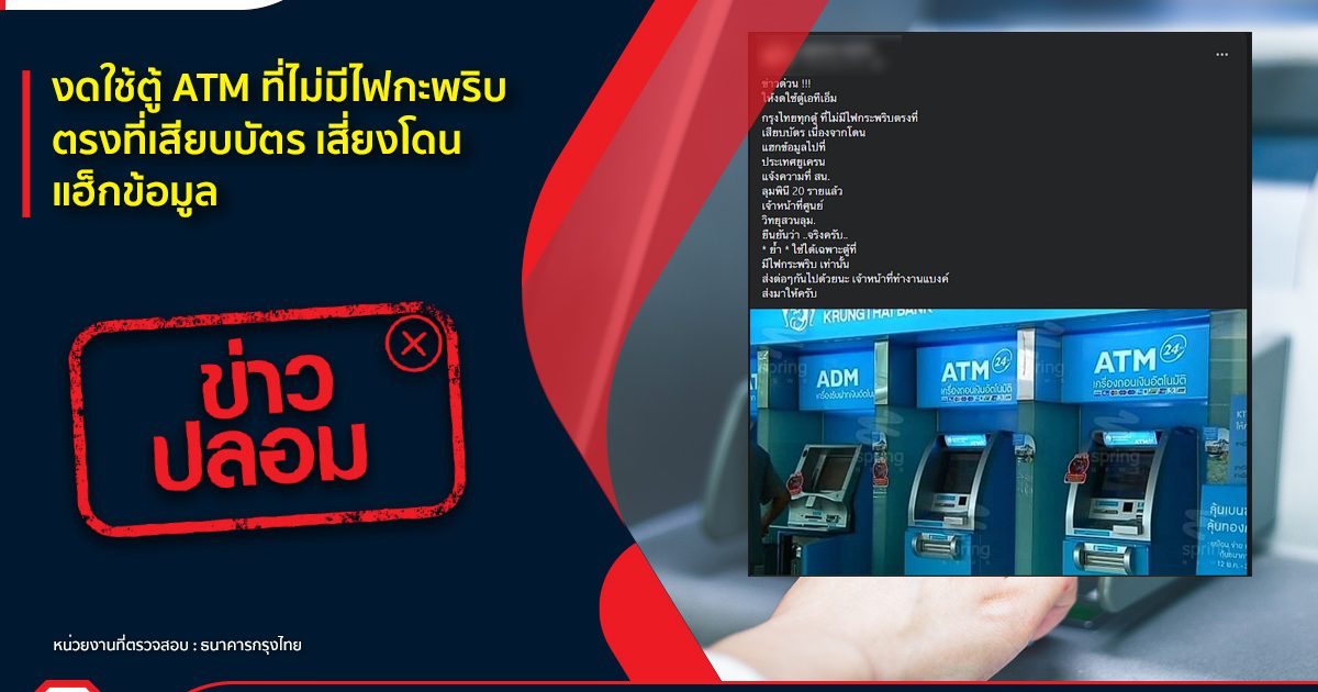 ประชาสัมพันธ์ข่าวปลอม “ใช้บริการตู้ ATM ที่ไม่มีไฟกระพริบตรงที่เสียบบัตร เสี่ยงโดนแฮ็กข้อมูล”